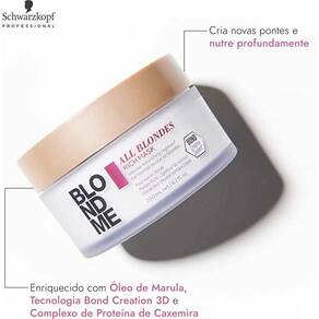 Máscara Capilar Schwarzkopf BlondMe All Blondes Rich 200ml Máscara capilar enriquecida para cabelos loiros. Schwarzkopf Professional BlondMe Todos os Loiros recupera os fios médios e grossos, para um brilho saudável. A Máscara Capilar Enriquecida Schwarzkopf Professional BlondMe All Blondes traz Óleo de Marula, Tecnologia Bond Creation 3D e Complexo de Proteína de Caxemira, para ajudar a criar novas pontes, enquanto nutre em profundidade o cabelo loiro normal ou espesso. Fortalece a estrutura capilar interna em até 93% - quando em conjunto com o Shampoo Enriquecido - enquanto proporciona maleabilidade e força. Modo de Uso: Em cabelo seco com toalha aplique a máscara capilar e deixe agir por 5 ou 10 minutos. Lave normalmente.