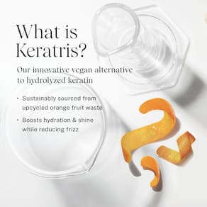 - Ingredientes limpos – Keratris, uma alternativa de queratina vegana proveniente de laranjas recicladas, ajuda a aumentar a hidratação e o brilho enquanto reduz o frizz. O hemisqualano ajuda a melhorar a saúde e a força do cabelo instantaneamente e ao longo do tempo, enquanto os aminoácidos suavizam as cutículas do cabelo para uma sensação mais sedosa e reduzem a aparência das pontas duplas.