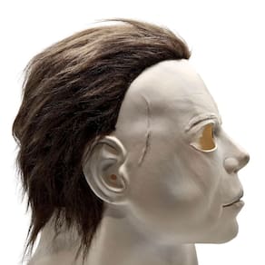 - DISEÑO REALISTA: Esta máscara captura el aspecto icónico de la franquicia de películas de terror Halloween, con un rostro pálido y sin emociones, cuencas oculares oscuras y huecas, y una peluca de cabello rizado negro.