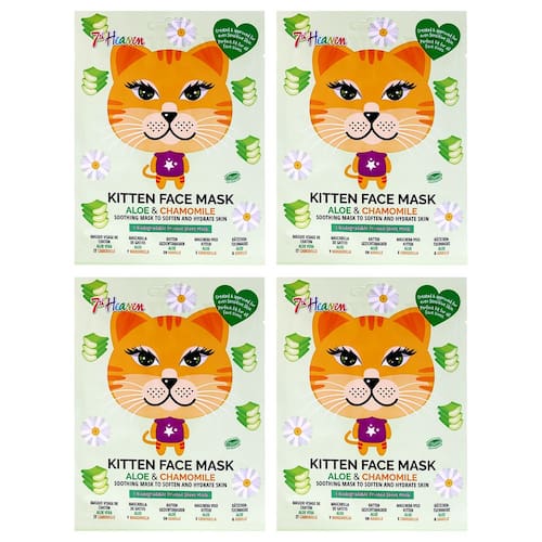 Estas quatro divertidas máscaras de lençol biodegradáveis estampadas em gatinhos, projetadas para acalmar, hidratar e suavizar a pele jovem. As máscaras são enriquecidas com uma mistura de pepino, aloe vera e camomila para fornecer cuidados de pele suaves e eficazes para crianças de 8 anos ou mais.