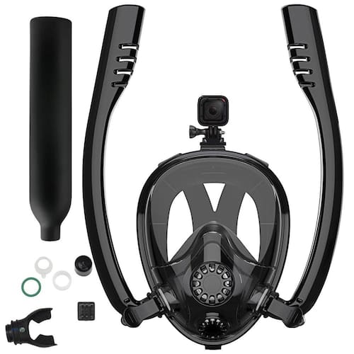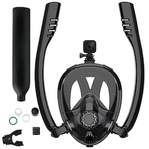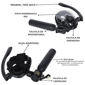O snorkel permite a respiração natural na superfície, enquanto o cilindro de oxigênio portátil com capacidade de 0,5L fornece autonomia de 5 à 7 minutos submerso, ideal para iniciantes e profissionais, sendo perfeito para mergulhos leves, observação marinha e treinos de respiração.
