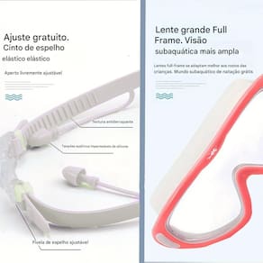 A Máscara De Natação Gold Sports Panoramic 9.0 High Definition 6 a 14 Anos Característica 1. Moldura de cloreto de polivinilo com revestimento resistente a impacto 2. Campo extra largo de visão: Nossa máscara de natação Gold Sports Infanto-Juvenil são projetados com lentes mais largas e possuem campo de visão de 180 graus. Proporciona máximo campo de visão e clareza para garantir seu filho tem uma experiência de natação mais confortável. 3. Design funcional: O novo botão de ajuste das tiras facilita o ajuste. O frame se encaixa perfeitamente, e o design mais largo distribui a pressão de forma mais uniforme, dando sua criança uma experiência de uso confortável. 4. Proteção antiembaçante e UVA e UVB400: Nossa máscara de natação infanto-juvenil são equipados com lentes de policarbonato resistente a impacto. Todas as lentes proporcionam proteção antiembaçante e anti-UVa e UVB400, que podem proteger os olhos do seu filho dos danos dos raios UV e proporcionar a melhor visão. 5. Os materiais mais seguros: Nossa máscara de natação é feito de silicone inodoro, hipoalergênico. O gascket da Mascara de natação possui Design 3D ergonômico encaixa perfeitamente na cavidade ocular de crianças e Adolececentes e seu silicoce e ultra soft anti alérgico. Acompanha um par de protetor de ouvido de silicone ultra soft e anti alérgico Marca: Gold Sports Composição: policarbonato óptico, silicone e PVC Garantia: 01 mês somente contra defeito de fabricação