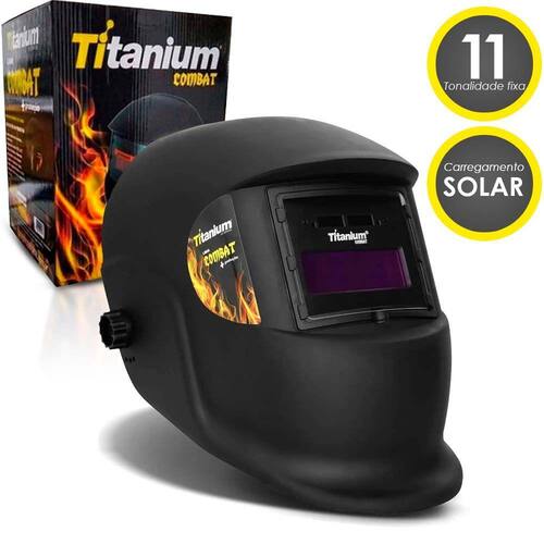 - Máscara de Solda Automática Sem Controlador Combat da Titanium possui escurecimento automático com lente protetora em acrílico, resistente a impactos e removível para limpeza. Proteção ultravioleta e infravermelho, movida a células solares e pilhas alcalinas.