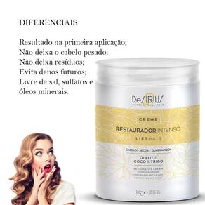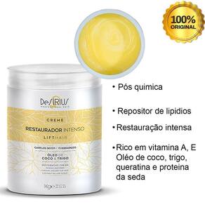 O Creme Restaurador Intenso atua nas áreas mais porosas, resultando em cabelos saudáveis, macios e brilhantes. Possui forte ação disciplinante e anti-frizz, com resultado IMEDIATO, desde à PRIMEIRA APLICAÇÃO.BENEFÍCIOSRecupera a proteção natural dos fios;Promove brilho intenso;Proporciona leveza;Forte ação disciplinante;Reduz o volume e o frizz;Hidrata e fortalece os fios.DIFERENCIAISResultado na primeira aplicação;Não deixa o cabelo pesado;Não deixa resíduos;Passo único;Evita danos futuros;Livre de sal, sulfatos e óleos minerais.INDICAÇÃOPara todos os tipos de cabelo, principalmente cabelos secos, volumosos e grossos, ressecados ou processados quimicamente.MODO DE USOCom os cabelos molhados, aplique o Creme Restaurador Intenso, enluvando os fios no sentido cuticular. Deixe agir de 5 a 10 minutos. Enxágue. Finalize com o Fluído Restaurador Intenso.ATIVOSVitamina A e E, óleo de coco, trigo, queratina e proteína da seda.