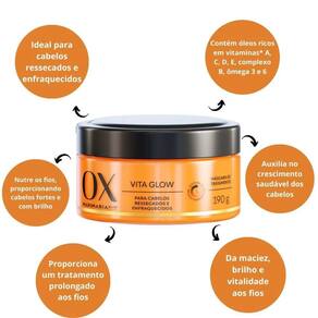 A Máscara de Tratamento Mari Maria Hair Vita Glow é ideal para cabelos ressecados e enfraquecidos. A combinação do blend de óleos ricos em vitaminas* A, C, D, E, complexo B, ômega 3 e 6 com o Sistema OX Beleza Duradoura, é a fórmula certa para nutrir os fios auxiliando no crescimento saudável dos cabelos. Sistema OX Beleza Duradoura: É uma tecnologia exclusiva, capaz de liberar sequencialmente os ingredientes, proporcionando um tratamento prolongado aos fios.Modo de UsoApós o uso do Shampoo, aplique a Máscara de Tratamento OX Mari Maria Vita Glow mecha a mecha deixe agir por 5 minutos e enxágue. Para melhores resultados, utilize toda a linha OX Mari Maria Vita Glow.ComposiçãoAQUA; CETEARYL ALCOHOL; DIMETHICONE; BIS-(ISOSTEAROYL/OLEOYL ISOPROPYL) DIMONIUM METHOSULFATE; STEARAMIDOPROPYL DIMETHYLAMINE; CYCLOPENTASILOXANE; CETRIMONIUM CHLORIDE; PARFUM; DIPROPYLENE GLYCOL; LACTIC ACID; DIMETHICONOL; BISAMINO PEG/PPG-41/3 AMINOETHYL PG-PROPYL DIMETHICONE; ETHYL LINOLEATE; ETHYL OLEATE; DISODIUM EDTA; BUTYLENE GLYCOL; BIS-LAURYL COCAMINOPROPYLAMINE/HDI/PEG-100 COPOLYMER; CRAMBE ABYSSINICA SEED OIL; PERSEA GRATISSIMA OIL*; HELIANTHUS ANNUUS SEED OIL*; GLYCERIN; AMYLOPECTIN; CI 15510; METHYLCHLOROISOTHIAZOLINONE/METHYLISOTHIAZOLINONE; CITRUS AURANTIUM DULCIS CALLUS CULTURE EXTRACT; COCOS NUCIFERA OIL*; LITHOTHAMNION CALCAREUM EXTRACT; LINUM USITATISSIMUM SEED OIL*; HYDROLYZED WHEAT PROTEIN; ZEA MAYS STARCH; ARGANIA SPINOSA KERNEL OIL*; MACADAMIA TERNIFOLIA SEED OIL*; OLEA EUROPAEA FRUIT OIL*; PANTHENOL; CI 17200; BIOTIN; CITRONELLOL; COUMARIN; GERANIOL; HEXYL CINNAMAL; d-LIMONENE; LINALOOL. *Vitaminas presentes dentro dos ingredientes: Abacate, Girassol, Coco, Linhaça, Argan, Macadâmia e Oliva.