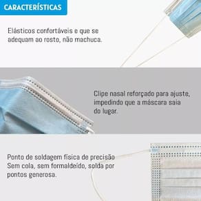 Material de Falso Tecido: Oferece conforto ao utilizar e evita irritações na pele. Estrutura Descartável: Ideal para uso único, garantindo máxima higiene. Alças Elásticas: Proporcionam ajuste seguro e confortável ao redor das orelhas. Três Camadas de Proteção: Filtragem eficiente de partículas e gotículas. Capacidade de Filtragem Atestada: 99,2% de eficácia contra gotículas e partículas virais.