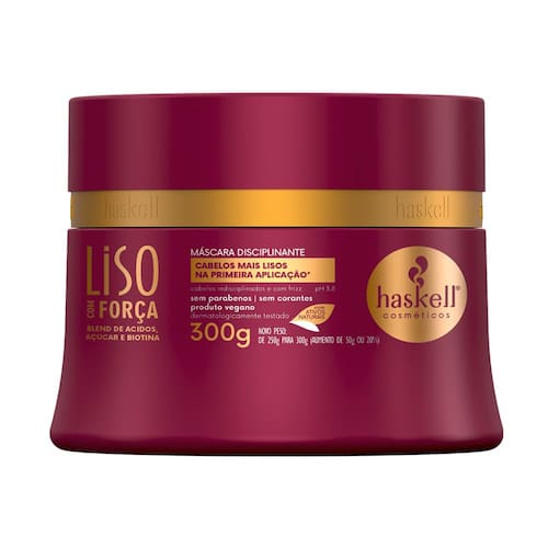 Máscara Disciplinante Haskell Liso com Força 300g Indicação: cabelos indisciplinados e com frizz. Trata intensamente os fios, deixando os cabelos hidratados, alinhados e macios, e prolonga o efeito li