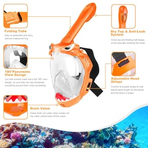 dcsvfdbdgbdfbfbdfbg - ?Design panorâmico de rosto inteiro de 180°?Nossa máscara de mergulho infantil oferece aos seus filhos um campo de visão de 180 graus e oferece vistas superiores sobre uma máscara de mergulho padrão para belas aventuras subaquáticas, o design de rosto completo permite que seus filhos respirem confortavelmente pela boca ou nariz durante o mergulho. - ?Sistema fácil de respirar seguro?A máscara de snorkel para crianças tem sistema de snorkel seco, projetada com canais separados para inalação e expiração para evitar risco de asfixia ou respirar duro por causa da mistura de gás de CO2 e ar. O ar fresco vai direto para o meio da máscara de mergulho infantil e é inalado através de 4 películas de válvula, enquanto o CO2 é expelido de ambos os canais laterais. - ?Tecnologia anti-vazamento e antiembaçamento?Feito de policarbonato de alta qualidade e silicone de grau médico. A borda de silicone macio se encaixa perfeitamente no rosto sem qualquer lacuna para deixar a água vazar. Canais separados de inalação e expiração impedem que a máscara superior de snorkel fique embaçada, e o revestimento antiembaçamento na lente e inserções antiembaçamento garantem um efeito antiembaçamento. - ?Segurança, conforto e fácil de transportar?Esta máscara de mergulho infantil tem uma faixa de cabeça ajustável. Você pode facilmente ajustar seu tamanho para caber confortavelmente na cabeça da criança. O tamanho é medido da sobrancelha até a parte inferior do queixo da criança. (Tamanho P: 8,5-10 cm/3,35-3,94 polegadas) Tubo de respiração dobrável torna a máscara de mergulho para natação mais portátil e economiza espaço. Seus filhos podem carregar a mochila sozinhos com máscara de snorkel. - ?Design adorável estilo tubarão?É um presente perfeito e a melhor escolha para crianças; use esta máscara esportiva de snorkel infantil e aproveite férias inesquecíveis. O conjunto de snorkel subaquático de rosto inteiro com espelho plano não distorcerá a visão do seu filho e causará tontura.