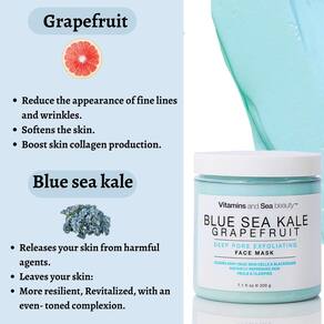 Máscara facial esfoliante profunda de poros com vitaminas e beleza do mar Esta máscara facial de limpeza contém ingredientes à base de plantas que limpam e desobstruem profundamente os poros, deixando você com uma pele brilhante e jovem. Este limpador facial de poros purifica a pele de sujeira e óleo, removendo cravos, encolhendo os poros e suavizando a textura irregular da pele. A máscara facial esfoliante limpa as células mortas da pele, refresca e esclarece. Nossas máscaras esfoliantes para homens e mulheres contêm couve do mar azul e extrato de toranja para suavizar e aumentar a pele, ajudando a reverter os sinais de rugas. Equilibra a descoloração e uma pele opaca para uma pele lindamente iluminada e equilibrada. Sobre vitaminas e beleza do mar "Marinha" o dia! A abundância de recursos de beleza natural e pura do mar que beneficia a beleza ajuda a revitalizar, nutrir e reter a umidade em nossa pele. As plantas marinhas são ricas em vitaminas, minerais, proteínas e aminoácidos... tudo o que precisamos para o equilíbrio e função corporal adequados. Estas plantas fornecem propriedades hidratantes e restauradoras, enquanto defendem contra o envelhecimento, protegem contra os danos do sol e ajudam a prevenir a acne. Ocorrendo naturalmente dentro e ao redor de nossos grandes corpos de água, os ingredientes em nossa linha Vitamins and Sea Beauty promovem uma pele brilhante e jovem. - Máscara esfoliante facial – uma máscara esfoliante que atua como um limpador profundo de poros. Remove sujeira, óleo e cravos. Desobstrui e encolhe os poros, suaviza a textura irregular da pele e rugas. - Blue Sea KALE – Uma planta marinha com poderes antioxidantes que libera sua pele de agentes nocivos, deixando-a mais resistente. Esta máscara facial deixa você com uma pele revitalizada e uniforme. - Toranja – Embalada com vitamina A, esta máscara facial firmadora ajuda a reduzir a aparência de linhas finas e rugas, suavizando a pele e aumentando a produção de colágeno da pele. - Fácil de usar – Basta aplicar uma fina camada desta máscara facial antienvelhecimento no rosto e pescoço, evitando o contato com os olhos. Deixe por 8 a 10 minutos ou até secar completamente. Enxágue com água morna. - Linda pele – Nossos produtos de cuidados com a pele de algas marinhas começam com poderosos ingredientes marinhos. Nossa missão é tornar essas fórmulas transformadoras facilmente acessíveis para uma pele bonita e brilhante todos os dias!