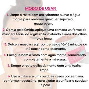 Modo de usar: Limpe o rosto com um sabonete suave e água morna para remover qualquer sujeira ou maquiagem. Com a pele úmida, aplique uma camada uniforme da máscara facial de argila rosa, evitando a área dos olhos e da boca. Deixe a máscara agir por cerca de 10-15 minutos ou até secar completamente. Enxágue bem o rosto com água morna, removendo completamente a máscara. Seque o rosto delicadamente com uma toalha limpa. Use a máscara uma ou duas vezes por semana, conforme necessário, para ajudar a purificar e suavizar a pele. Evite o contato com os olhos. Se ocorrer irritação, interrompa o uso.