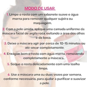 Modo de usar: Limpe o rosto com um sabonete suave e água morna para remover qualquer sujeira ou maquiagem. Com a pele úmida, aplique uma camada uniforme da máscara facial de argila rosa, evitando a área dos olhos e da boca. Deixe a máscara agir por cerca de 10-15 minutos ou até secar completamente. Enxágue bem o rosto com água morna, removendo completamente a máscara. Seque o rosto delicadamente com uma toalha limpa. Use a máscara uma ou duas vezes por semana, conforme necessário, para ajudar a purificar e suavizar a pele. Evite o contato com os olhos. Se ocorrer irritação, interrompa o uso. Ean: 7898920512078