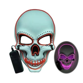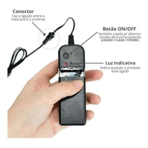 Produzida em material plástico resistente, a máscara possui fios de LED que atravessam as regiões dos olhos, nariz e boca, proporcionando um efeito luminoso incrível. Com elástico de larga espessura na parte de trás e orifícios estrategicamente posicionados para os olhos, nariz e boca, ela garante conforto, visibilidade e facilidade na respiração.