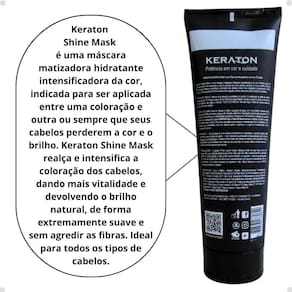 Keraton Shine Mask é uma máscara matizadora hidratante intensificadora da cor, indicada para ser aplicada entre uma coloração e outra ou sempre que seus cabelos perderem a cor e o brilho. Keraton Shine Mask realça e intensifica a coloração dos cabelos, dando mais vitalidade e devolvendo o brilho natural, de forma extremamente suave e sem agredir as fibras. Ideal para todos os tipos de cabelos. . Prova de Toque: Aplique uma pequena quantidade do produto no antebraço dou atrás da orelha. Deixe agir por 15 minutos e lave. Se em 48 horas surgir irritação na pele, coceira ou ardor no local e ou proximidades, não utilize o produto. . Teste de Mecha: Sempre faça o teste de mecha antes de aplicar o produto por todo o cabelo. . Modo de Uso: Lave os cabelos e retire o excesso de água com uma toalha, coloque luvas, aplique o produto por toda a cabeça de maneira uniforme e massageie suavemente. Aguarde 3 a 5 minutos de acordo com a intensidade desejada e enxágue bem até eliminar o excesso do produto. Nas cores matizadoras claras Sempre faça o Teste de Mecha antes de aplicar por todo o cabelo. Para determinar o tempo de pausa necessário para atingir a neutralização da cor desejada. Obs: sempre que necessário pode ser utilizado após o shampoo no lugar do condicionador como manutenção da cor. . Atenção: Por se tratar de uma máscara tonalizante por deposição, o produto poderá soltar pigmentos nas primeiras lavagens. A cor natural e a porosidade de seus cabelos pode influir no resultado final da aplicação. Keraton Shine Mask não clareia os cabelos, não cobre fios brancos, dependendo da porosidade dos mesmos, ele pode dar um suave reflexo nos fios brancos. Mantenha fora do alcance das crianças.