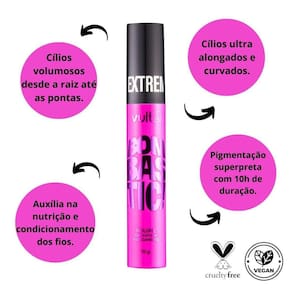 Modo de Uso: Com o auxílio da escova, passe a máscara acompanhando a forma natural dos cílios, no sentido da raiz para as pontas. Construa camadas até obter o efeito desejado.