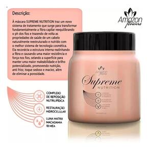 A Máscara Supreme Nutrition é um sistema de tratamento que transforma a fibra capilar, reequilibrando o pH dos fios e restaurando as propriedades de saúde de um cabelo naturalmente reestruturado e nutrido com a melhor tecnologia cosmética. Este produto reconecta a estrutura interna, realinhando a fibra e proporcionando maior resistência e força nos fios. Sela a superfície para manter uma maior maleabilidade e brilho potencializado, promovendo nutrição, anti frizz e um toque sedoso e maciez, além de eliminar a porosidade. Ativos do produto: Luna Matrix, Macadâmia e IBMEA. Ph: 3.5a 4.5 Instruções de uso: Lave os cabelos com um shampoo, recomendamos o shampoo nutritivo Stop Quebra Therapy ou o shampoo Intensificare, pois são específicos para a higienização de cabelos sensibilizados. Após lavar os cabelos, retire o excesso de água e aplique o produto, mecha a mecha, massageando e enluvando. Deixe agir por 20 minutos, depois enxágue e finalize como desejar. Dica: para uma finalização térmica, acentuando ainda mais a nutrição, utilize o Perfect Repair ou qualquer um dos nossos finalizadores. de fábrica: 36 dias Anvisa: 25351966953202035 Marca: Não Informado Ean: 7890950880059