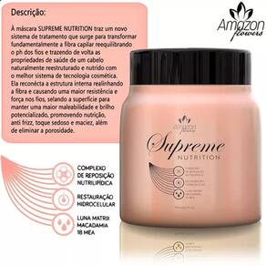Máscara supreme nutrition: À máscara supreme nutrition traz um sistema de tratamento que surge para transformar fundamentalmente a fibra capilar reequilibrando o ph dos fios e trazendo de volta as propriedades de saúde de um cabelo naturalmente reestruturado e nutrido com o melhor sistema de tecnologia cosmética. Ela reconecta a estrutura interna realinhando a fibra e causando uma maior resistência e força nos fios, selando a superfície para manter uma maior maleabilidade e brilho potencializado, promovendo nutrição, anti frizz e um toque sedoso e maciez, além de eliminar a porosidade. Ativos do produto: luna matrix, macadâmia e ibmea ph: 3.5a 4.5 Passo a passo: Lavar os cabelos com um shampoo, indicamos o shampoo nutritivo stop quebra therapy ou shampoo intensificare, por ser um shampoo especifico para higienização dos cabelos sensibilizados. Aplicação: Após lavar os cabelos, retire o excesso de água e aplique o produto, mecha a mecha, Massageando e enluvando; Pausa: 20 minutos depois, enxaguar e finalizar como desejar. Dica: para uma finalização térmica, acentuando ainda mais à nutrição, utilize o perfect repair ou qualquer de nossos finalizadores. do vendedor: 35 dias Marca: Não Informado