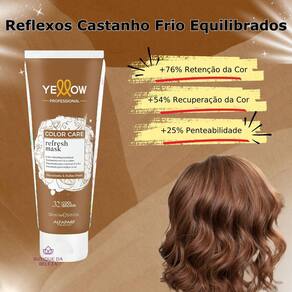 Somos a butique da beleza Uma empresa especializada no comércio de cosméticos e semijoias. Estamos sempre entre os melhores vendedores. Nosso compromisso é com você Seu conforto e segurança são nossos propósitos Servir e ajudar são nossos deveres Máscara yellow color care refresh mask .32 Se você está procurando manter a intensidade dos seus cabelos castanhos tingidos ou com tonalidades escuras, a máscara yellow color care refresh mask .32 é a escolha ideal. Formulada para proteger e intensificar as cores escuras, ela proporciona um cuidado profundo, mantendo o brilho e a hidratação que seus fios merecem. Indicado para qual tipo de cabelo Perfeita para cabelos castanhos ou escuros tingidos, ajudando a manter o tom vibrante e protegido do desbotamento. Benefícios Realce de cor: intensifica e protege tons castanhos e escuros. Hidratação profunda: nutre os fios sem pesar. Brilho intenso: deixa os cabelos com um brilho saudável e duradouro. Modo de uso Aplique a máscara nos cabelos úmidos, distribuindo do comprimento às pontas. Deixe agir de 3 a 5 minutos e enxágue. Use semanalmente para manter a cor viva e o cabelo hidratado. Com a máscara yellow color care refresh mask .32, seus cabelos castanhos ficarão sempre radiantes e cheios de vida Marca: Não Informado