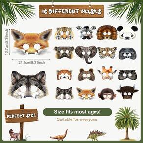 Material: Tamanho do papel: 21 x 13,7 cm Peso: 108 g Material: papel Tamanho: 21 x 13,7 cm Peso: 108 g de máscaras divertidas com temas de animais, incluindo tigre, zebra, leão, panda e muito mais, perfeitas para festas de aniversário infantis e eventos de cosplay. Material de papel de alta qualidade, confortável e seguro para as crianças usarem durante brincadeiras, festas ou eventos. Desenhos realistas de cabeças de animais, oferecendo uma experiência divertida e envolvente para crianças e adultos em festas temáticas de selva ou de animais. Ideal para festas com temas de animais, eventos de Halloween ou encontros de cosplay, oferecendo ótimas oportunidades fotográficas e entretenimento. Fácil de usar e leve, cada máscara possui orifícios recortados para uma visão clara e uma faixa elástica para um ajuste seguro em vários tamanhos de cabeça.