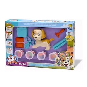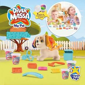 Diver Massa My Pet - Massinha de Modelar comCom o kit Diver Massa My Pet, a diversão é garantida! As crianças podem soltar a imaginação e criar pelinhos de massinha colorida para seus pets de brinquedo, moldando-os nas orelhas, nas costas e até mesmo fazendo um topete maravilhoso!Muita diversão com criatividade e cuidados!Além de moldar pelinhos e criar penteados incríveis, o kit vem com forminhas especiais para fazer trancinhas super estilosas. E tem mais! O kit veterinário incluído permite que as crianças cuidem de seus pets quando eles ficarem dodói, estimulando a brincadeira de faz-de-conta e o cuidado com os animais.Tudo o que você precisa em um só kit!O Diver Massa My Pet vem com:4 potes de massinhas coloridas (Cada pote com 3 cores diferentes)Forminhas para trancinhas