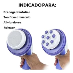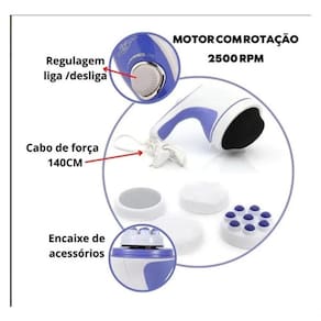 Portátil e prático, ajuda a eliminar gorduras e esculpir o corpo, através de seu movimento orbital e poderosa vibração. Com um giro de RPM e quatro acessórios, é ideal para uso a qualquer hora em qualquer lugar. Tonifica os braços Alivia a tensão e o nos ombros e nas costas Define e esculpe o Abdômen modela e tonifica os quadris Modela e alivia a tensão muscular nas pernas e coxas, relaxa o músculo cansado e dolorido da panturrilha com o uso da lixa remove calosidades e pele seca dos pés, alem de proporcionar uma deliciosa e relaxante massagem nesta . Alta Rotação (2500 RPM) Vibrações Vigorosas Relaxa os músculos contraídos Intensidade da Massagem Regulável.