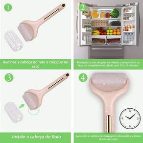 1. Retire a cabeça do rolo e mantenha-o no freezer/geladeira de 10 a 15 minutos antes de utilizar, isso causará um efeito melhor. 2. Limpe a área de tratamento e aplique creme ou gel na pele. 3. Pegue o rolo do freezer e instale-o na alça. Role suavemente em torno da área de tratamento, especialmente em torno da área dos olhos. 4. Limpe o rolo com algodão e 70% de álcool. Atenção: o rolo pode ir ao congelador na temperatura acima de 0ºc, por 10 à 15 minutos antes do contato com a pele
