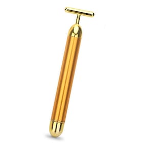 Massageador Facial Energy Beauty Bar GoldenBenefícios:- Ajuda na prevenção do envelhecimento, estimulando a criação do colágeno, deixa sua pele saudável e renovada.- Remove á papada- Reduz o volume facial- Reduz rugas faciais- Firma á pele- Reduz olheiras- Portátil, pode leva-lo na bolsa e utilizar no local de sua preferenciaModo se usar:Faça movimentos ascendente e descendente em todo o rosto.Em volta dos olhos e faça todo o contorno, concentre-se nos pés de galinhas, movimentando na para cima e para baixo.Na testa e na linha do sorriso bigode chines , role em um movimento para cima e para baixo. Mova-se através da testa usando os mesmos movimentos.No pescoço, comece com a base do pescoço e se mova para cima em direção à linha da mandíbula. Repita o mesmo movimento por todo o pescoço.Use-o três vezes por dia durante três minutos cada um para ver não só benefícios anti-envelhecimento, mas também benefícios para a saúde.Características:- A prova d'água- 6.000 rotações por minuto- Tamanho: 14 x 3 cm- Funciona com 1 pilha AA Inclusa
