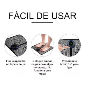 Nossa principal missão é trazer a qualidade de nossos produtos, com um preço acessível e a confiança que você merece.Seja muito bem vindo(a)!Conheça agora o Massageador Para Pés Pernas Ems Magnético Relaxante Pro-Massageador Para Pés Pernas Ems Magnético Relaxante Pro:Massageador de PÉS EMS PRO, o mais novo relaxante muscular!Se você também sente dores nos pés, você faz parte de 36% da população de todo o mundo que também sentem o mesmo problema, mais não se preocupe, trouxemos para você o mais inovador e tecnológico massageador de pés do mundo. Ele age nas dores por ELETROESTIMULAÇÃO, ondas magnéticas de baixa e media intensidade, que em poucos minutos de uso já trazem um relaxamento nos músculos dos pés, deixando muito conforto e satisfação após o uso.Depois de um dia estressante de trabalho , nada melhor que uma massagem relaxante nós pés. Segundos estudos recentes, massagens nos pés aumentam consideravelmente o nível de SEROTONINA, hormônio responsável pelo HUMOR e BEM-ESTAR. Trazendo assim muito conforto e qualidade de vida para os usuários do produto.O que é a TECNOLOGIA EMS?Estimulação elétrica do músculo (ems), igualmente como a eletroestimulação neuromuscular (nmes) é a incitação da contração do músculo usando impulsos elétricos. As ondas magnéticas do aparelho imitam o potencial de ação proveniente do sistema nervoso central, fazendo com que os músculos se contraiam. O método EMS já foi provado e comprovado ser bastante eficaz tanto para relaxamento como para o fortalecimento muscular.Para que é ULTILIZADO o EMS?* Objetivos de reabilitação de fortalecimento muscular.* Prevenção da atrofia do músculo, aumentando a circulação sanguínea.* Relaxamento dos músculos, tonificação muscular magnética.* Escolha 8 tipo modos com operação.* Desligamento automático após 10 minutos de uso.* A intensidade da estimulação é em 20 níveis.* Motorzinho desliga automaticamente cerca de 15 segundos sem os pés no tapete EMS.ESPECIFICAÇÕES:* Motor recarregável via USB.* Tapete EMS vem com uma película siliconada.* Cabo USB incluso no pacote.* Tamanho do tapete: 28 cm x 31 cm.* Manual de instruções