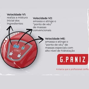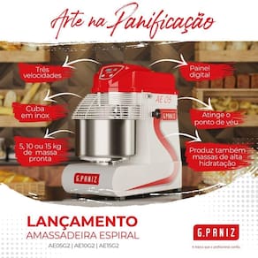 Masseira Espiral 5kg 3 Velocidades Ae05 G2 G.paniz Amassadeira Epóxi 220v Amasseira Espiral 5kg 3 Velocidades AE05G2 G.Paniz. Ideal para a produção dos mais variados tipos de massas pesadas de panificação, como pães básicos, de alta hidratação, fermentação natural, pães doces e pizzas. Possui painel de controle digital. Cuba giratória em aço inox 304. Baixo nível de ruído. Batedor espiral em ferro fundido com revestimento em estanho. CAPACIDADE: 5Kg de massa pronta. CAPACIDADE DE FARINHA: 3Kg. POTÊNCIA: 1/2CV. CONSUMO MONOFÁSICO: 0,88kW/h. QUANTIDADE DE VELOCIDADE: Três velocidades: V1 (realiza a mistura inicial dos ingredientes), V2 (amassa e atinge o ponto de véu de massas convencionais e ME (amassa e atinge o ponto de véu de massas especiais com alto nível de hidratação). PESO: 40kg. DIMENSÕES(CxAxL): 29,4x57x57,7cm. Equipamento certificado pelo OCP 0070 conforme Portaria Inmetro - 148/2022. Amasseira Espiral 5kg 3 Velocidades AE05G2 G.Paniz é na Atau. Apresentação do Produto - Marca - G.Paniz Modelo - AE05G2 Capacidade - 5Kg Frente - 29,4cm Altura - 57cm Profundidade - 57,7cm Motor - 1/2CV Peso - 40Kg Consumo - 0,88Kw/h