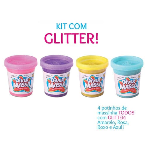 Massinha de Modelar - Diver Massa - Glitter - 4 Potes - Divertoys: as massinhas de modelar Diver Massa nunca saem de moda. É garantia de diversão e desenvolvimento para as crianças. Esse pacote vem com 4 potes de massinha de modelar com glitter! As crianças podem soltar a imaginação e brincar de montão colocando a mão na massa. Cada potinho Diver Massa tem 50g. Cores: Amarelo, Rosa, Roxo e Azul. Tudo para incentivar a criatividade e imaginação! Informações: • Produto: Massinha de Modelar Kit com Glitter • Marca: Divertoys • Coleção: Diver Massa • Tipo: Massinha de Modelar com Glitter • Categoria: Artes e Atividades • Subcategoria: Massinha de Modelar • Tamanho: pote 5.1 x 5.6 cm • Peso líquido: 200g total • Conteúdo: 04 potinhos de massinha Diver Massa • Recomendação: para crianças a partir de 02 anos de idade Especificações: • Modelo: Kit Massinha c/Glitter (4 Unidades) • Referência: 8123 • Código de Barras: 7898639381231 • Embalagem (C x A x L): 24.5 x 06 x 05 cm • Embalagem (Peso): 0.267 kg • Material / Composição: fórmula diver massa • Registro: CE-BRI/APTA-N00004-20 • Certificado: Órgãos Autorizados - OCP´S (Organismos de Certificação de Produtos) Benefícios de brincar: • Eleva a autoestima • Exercita a memória • Estimula o raciocínio • Exercita o imaginário • Desenvolve a criatividade • Desenvolve percepção visual • Desperta a atenção e curiosidade • Desenvolvimento neuropsicológico • Estimula habilidades motoras básicas • Incentiva a comunicação e linguagem • Desenvolve aspectos emocionais e afetivo • Estimula o reconhecimento de formas e cores Aviso: • As imagens são meramente ilustrativas • Os pesos, tamanhos e medidas são aproximados • As cores e estampas dos produtos podem ter variações • As informações são de responsabilidade do fabricante ou fornecedor