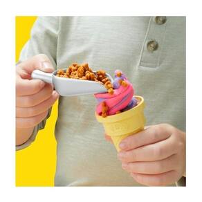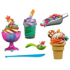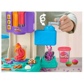 Kit Sorveteria Colorida permite criar sorvetes de todos os tipos de formas Basta inserir 2 ou mais cores Play-Doh no brinquedo e pressionar a manivela para ver a taça girando e a massa descendo como se fosse um sorvete. As crianças podem criar granulados e outras decorações de Play-Doh como pretzel, frutas e doces. Este kit vem com 5 potes de massa de modelar Play-Doh, sendo 3 potes exclusivos com cores duplas e 7 acessórios como cone de sorvete, prato, taça com tampa, entre outros.