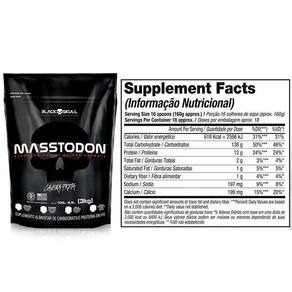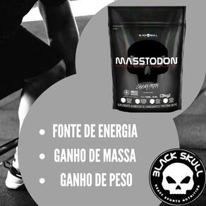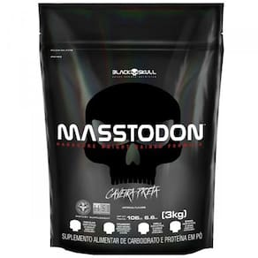 Hipercalórico Masstodon - Pacote 3000g - Black Skull Masstodon® da linha Caveira Preta Series® da Black Skull USA? é uma nutrição em formato portátil e para o dia a dia. Um hipercalórico para auxiliar na recuperação muscular após, exercícios intensos e no aumento da massa magra. Contém 12g de Proteína, 138g de Carboidrato, 2g de Gorduras e 618kcal por dose! Recomendado o consumo de 160g (16 colheres de sopa). Ingredientes Maltodextrina, proteína concentrada do soro de leite, cacau em pó, aromatizante e edulcorante sucralose. NÃO CONTEM GLÚTEN. Sugestões de Uso Misture 16 colheres de sopa (aprox.160g) de Masstodon® em 300ml a 390ml de água ou de acordo com a consistência desejada. Importante que seu consumo esteja associado a uma alimentação equilibrada.
