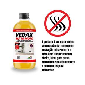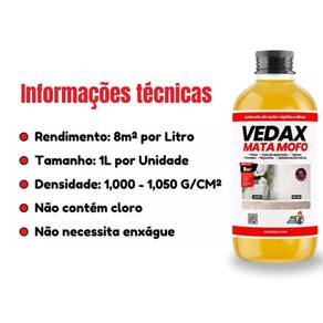 Mata mofo vedax não volta anti mofo parede teto piso 1lt Vedax mata mofo: elimine e previna mofo com eficácia prolongada em pisos, paredes e telhados, sem cloro Texto do anúncio: O vedax mata mofo é a solução eficaz para eliminar e prevenir a formação de mofo, garantindo proteção prolongada contra fungos, algas e leveduras. Com alta capacidade de e ação rápida, ele atua profundamente nas superfícies, sem causar danos, pois sua fórmula não contém cloro. Ideal para aplicação em pisos, tetos de banheiro, telhas, paredes antes da pintura, rejuntes, madeiras e armários. Simples de aplicar e sem necessidade de enxágue, o vedax mata mofo é perfeito para ambientes críticos onde o controle de microrganismos é essencial. Usos recomendados: Pisos Tetos de banheiro Telhas Paredes pré-pintura e repintura Rejuntes Madeiras/armários Vantagens: Aplicação fácil e rápida Fórmula sem cloro, não agride as superfícies Eficaz no combate a microrganismos Ação prolongada e sem necessidade de enxágue Ideal para prevenir e eliminar mofo Instruções de uso: Agite antes de usar. Dilua o produto na proporção de 1:1 com água limpa. Aplique com pulverizador de baixa pressão, rolo de lã, trincha de nylon ou pincel. Em superfícies como tetos, paredes e telhados, aplique um acabamento pintura ou revestimento após a sanitização. Preparação da superfície: remova sujidades e mofo com hidrojateamento ou técnicas mecânicas, lave com detergente neutro e deixe secar antes da aplicação. Recomendações: Não aplicar em dias chuvosos. Aguardar 24 horas antes de pintar. Reaplique a cada 2 anos em áreas críticas. Vedax mata mofo: proteja suas superfícies de forma eficaz, rápida e sem complicações Marca: Não Informado