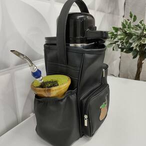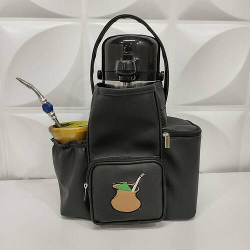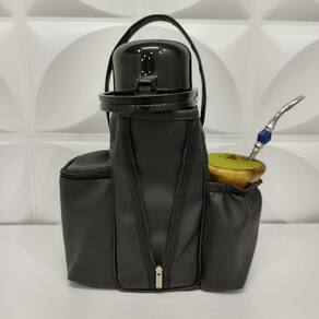 Possui 30 cm de altura x 29 cm de comprimento x 14 cm de largura. Possui 3 bolsos (um para o pacote de erva, um para a cuia e outro com zíper para levar objetos) e 1 compartimento principal para a térmica. Alça de mão. Possui forração interna. Metais Niquelados.