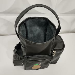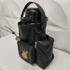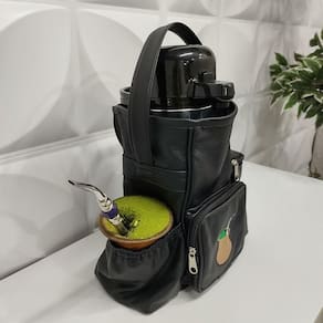 A nossa Bolsa Mateira confeccionada em Couro possui compartimento para térmica com redução de tamanho nas costas (desse modo pode acomodar tanto a térmica grande quanto o modelo menor), possui um bolso para o pacote de erva mate, um bolso para a cuia e um bolso de zíper para levar objetos que desejar. Possui uma alça de mão para facilitar o transporte.