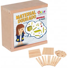 O Material Dourado foi desenvolvido com o objetivo de auxiliar o ensino e a aprendizagem da matemática.Descritivo Detalhado: Material dourado individual 111 peças Confeccionado em madeira, 111 peças composto por 1 prisma representando as centenas medindo 10 x 10 x 1 cm, 10 prismas representando as dezenas medindo 10 x 1 x 1 cm, 100 cubos medindo 1 x 1 x 1 cm representando as unidades.Embalagem: Caixa de M.D.F. medindo 12,5 x 12,5 x 6 cm, com tampa serigrafada.Lacrada com película de P.V.C. encolhível.