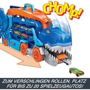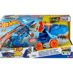 Transforme o Hot Wheels City Ultimate Hauler de um transportador de mais de 20 carros de brinquedo em um T-Rex rosnando e pisoteando! Role o caminhão e observe-o devorar veículos em escala 1:64 em seu caminho. Use-o para armazenar mais de 20 carros em escala 1:64! Puxe a cauda para trás e o caminhão se transforma em um T-Rex que tem ação de pisada animada acompanhada de luzes e sons. A parte de trás do T-Rex é uma pista de corrida de duas pistas. Corra com os carros Hot Wheels incluídos; o vencedor continua, enquanto o segundo colocado fica 'cagado' no dinossauro. As crianças podem lançar seus carros pela boca do T-Rex e parece que ele está cuspindo. Luzes e sons aumentam a diversão com olhos vermelhos brilhantes e arrotos, mordidas e peidos! O Hot Wheels City Ultimate Hauler inclui 2 carros Hot Wheels em escala 1:64, sendo um ótimo presente para crianças a partir de 4 anos.