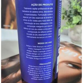 MODO DE USO Aplique o Violet Shampoo nos cabelos úmidos, massageie intensamente e enxágue. Repita a operação e deixe o produto interagir com os cabelos por 2 minutos, massageando e estimulando a fibra capilar. Enxágue abundantemente.