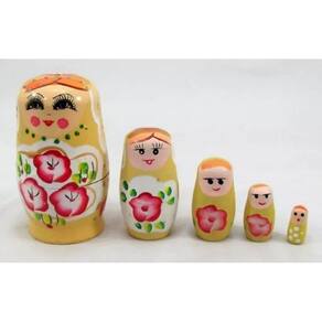Matriosca Boneca Russa com 5 bonecas 12cm alt. Amarela Matryoshka, boneca russa é um brinquedo tradicional Da Rússia, constituída por uma série de bonecas, feitas de Diversos materiais, que são colocadas umas dentro das outras, Da maior exterior até a menor A palavra provém do diminutivo do nome próprio Matryona. A sua forma é simples, mais ou menos cilíndrica e arredondada E mais estreita na parte superior, onde se situa a cabeça da Boneca. Não têm mãos a não ser as que são pintadas na s sua s Superfície s . O grau de sofisticação das matrioscas reside, de facto, na Complexidade dos motivos pintados Temos outras cores de bonecas Antes de efetuar a compra verifique se temos a cor desejada Em estoque. Simboliza a maternidade e fertilidade Produzida em madeira