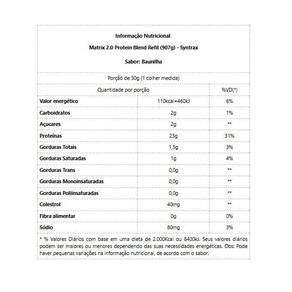 Matrix 2.0 Protein Blend Refil 907g - Sabor: Vanilla Matrix 2.0 Protein Blend Refil 907g O Matrix 2.0 Sustained-Release Protein Blend da Syntrax, é uma nova proposta de blend proteico, importante para pessoas que necessitam um aporte maior de proteínas na dieta com diferentes níveis de absorção. A Caseína Micellar é uma proteína derivada do leite que, ao contrario de outras caseínas, não é desnaturada durante seu processo de obtenção, o que permite alcançar concentrações de até 80% de caseína e 20% de proteínas derivadas do soro do leite Whey Protein ; ou seja, trata-se de uma proteína pura e super concentrada que fornece excelentes quantidades de aminoácidos e por isso atua de maneira mais eficaz na nutrição das fibras musculares fornecendo substratos suficientes para sustentar a massa magra e evitar o catabolismo. O Whey Protein proteína do soro do leite , é um produto resultante da ultrafiltração, microfiltração e ionização do soro do leite, processo pelo qual consegue-se isolar a proteína solúvel do leite com mínima quantidade de lactose e gordura, obtendo-se um produto de alto valor biológico. benefícios: Baixo teor de carboidratos; 0% de aspartame; Sabor incrível; Enriquecido com Glutamina Peptídeo; Proteína de liberação gradual 8 horas ; Liberação gradual no organismo Sustained-Release . Marca: Não Informado Ean: 810007540900