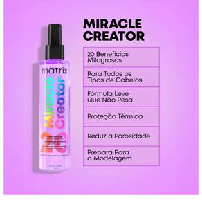 O Matrix Miracle Creator Spray 190?ml reúne 20 efeitos em um único produto: desembaraça, nutre, hidrata, protege do calor, reduz frizz, fortalece, melhora o brilho, a maleabilidade, suaviza pontas, repara danos, prolonga a cor, doa força, dá toque sedoso, ajuda na secagem, protege os fios UV, redefine os cachos, hidrata a fibra, reduz volume, dá equilíbrio térmico e facilita o styling. Leve e versátil, é ideal para todos os tipos de cabelo, promovendo resultados visíveis e instantâneos, com performance profissional em casa.