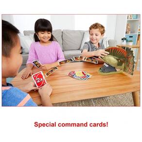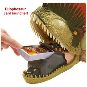 UNO Attack Jurassic World Dominion é uma versão temática do clássico jogo de cartas UNO, que inclui um lançador eletrônico em formato de cabeça de dinossauro com luzes e efeitos sonoros. As cartas são carregadas no lançador e a partida segue as regras tradicionais de combinação de cores e números até que um jogador ative o modo de disparo.?