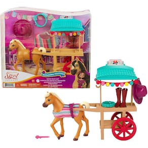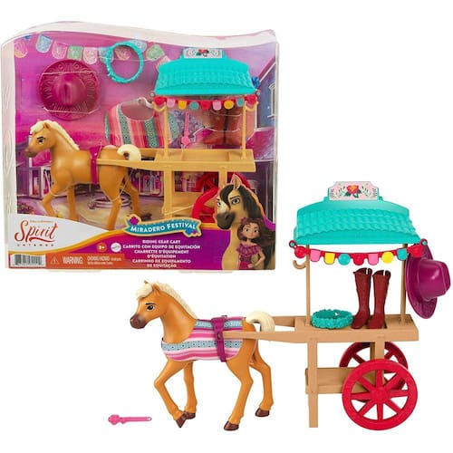 . Faça parte da amizade, bravura e aventura com o filme de animação da DreamWorks, Spirit Untamed! Pronto para o negócio, o adorável carrinho de engrenagem miradero festival vem com rodas de rolamento real, um dossel, decoração colorida e é puxado por um pônei de 5 em/12,7cm! Outras características incluem um par de botas, uma alça de bota, um chapéu e acessórios de coroa floralKids pode recriar cenas de festival do filme e executar o carrinho de engrenagem de condução! É um grande presente para crianças de 3 anos ou mais, especialmente para quem ama festivais, cavalos e animais!
