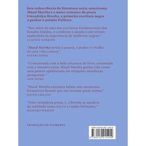 Uma joia redescoberta da literatura norte-americana, Maud Martha é o único romance de Gwendolyn Brooks, aclamada poeta e primeira escritora afro-americana a ganhar o prêmio Pulitzer. Maud Martha Brown é uma menina negra que cresceu no South Side de Chicago, na década de 1940. Ela sonha com Nova York, um romance e seu futuro. Ela adora dentes-de-leão, aprende a tomar café, apaixona-se, decora sua cozinha, visita o Jungly Hovel, estripa uma galinha, compra chapéus, dá à luz. Mas seu marido de pele mais clara também tem sonhos: quer entrar para o Foxy Cats Club, deseja outras mulheres, fantasia com a guerra. No passar do tempo, “fragmentos de um ódio confuso” estão sempre presentes: a forma como uma vendedora a tratou; uma ida ao cinema; a crueldade que sofre em uma loja de departamentos. A partir de breves vinhetas, Gwendolyn Brooks constrói um retrato extraordinário de uma vida comum, marcada por sabedoria, humor, raiva, dignidade e alegria. Publicado pela primeira vez em 1953 e inédito no Brasil, o livro inclui um prefácio de Margo Jefferson, que destaca a capacidade da protagonista de reivindicar seus próprios direitos e liberdades através da imaginação. “Quero que todos leiam este tesouro literário perdido.” — Bernardine Evaristo “Maud Martha encontra beleza nos momentos brutais que nos tornam quem somos.” — Raven Leilani “Nas mãos de uma das escritoras fundamentais dos Estados Unidos, o cotidiano é alçado a um retrato esplêndido da experiência de mulheres negras.” — Claudia Rankine