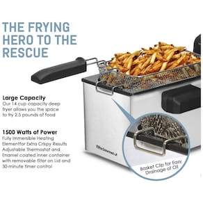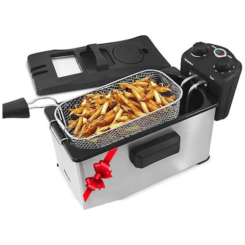 Fritadeira elétrica profissional Elite Gourmet EDF 3500 com capacidade de 3L, 1500W, temperatura ajustável até 190°C, temporizador de 30 minutos e corpo em aço inoxidável.Porta-fio