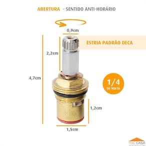 Abertura sentido anti-horário. Estria padrão Deca, compatível com torneiras de cozinha, banheiro e tanque.