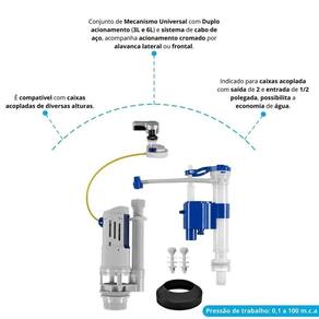 Conjunto de Mecanismo Universal com Duplo acionamento e sistema de cabo de aço da Astra. Acompanha acionamento cromado por alavanca lateral ou frontal. Acionamento lateral e frontal. Acompanha parafusos de fixação, bolsa de vedação e botão de acionamento. Produto submetido a testes de desempenho de acordo com a Norma NBR 15491:2010. Material: Polipropileno Acompanha Manual de Instalação: Sim Acompanha Manual de Instruções: Sim Altura: 55 cm Ambiente Principal: Banheiro Comprimento: 27 cm Cor: Branco e Azul Cor do Produto: Branco e Azul Cor Predominante: Branco Dicas de Instalação: Alavanca Indicado para: Caixa de Descarga Acoplada Itens Inclusos: Mecanismo de saída, mecanismo de entrada, bolsa de vedação e parafusos de fixação. Largura: 8,4 cm Manual de Montagem e Instalação: https://product-hub-prd.madeiramadeira.com.br/931094/documents/9668f46d-99e5-466f-9dfe-5ae0b6a1e00b226505332917247716741311.pdf Origem do Produto: Nacional Peso: 0,58773 kg Possui Duplo Acionamento: Sim Pressão Máxima: 100 Pressão mínima: 1 Recomendações de Uso, Manutenção e Limpeza: Para bacias com caixa acoplada com saída de 2" e entrada de 1/2", os conjuntos universais com acionamento duplo são indicados para todos os tamanhos de caixa e geram economia de água por possuir acionamento parcial e total da descarga.