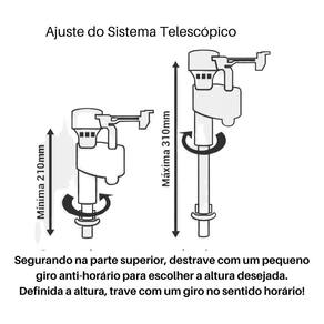 Descrição Mecanismo de entrada para caixas acopladas com acionamento vertical e ajuste do nível de água feito através do parafuso regulador. Permite instalação em diversos níveis, sendo compatível com caixas acopladas de diversas alturas. O nível de água se mantém mesmo com variação de pressão. Compatível com qualquer modelo e marca de caixa acoplada. Material: liga de cobre, plástico de engenharia e elastômero. Marca: Siamp