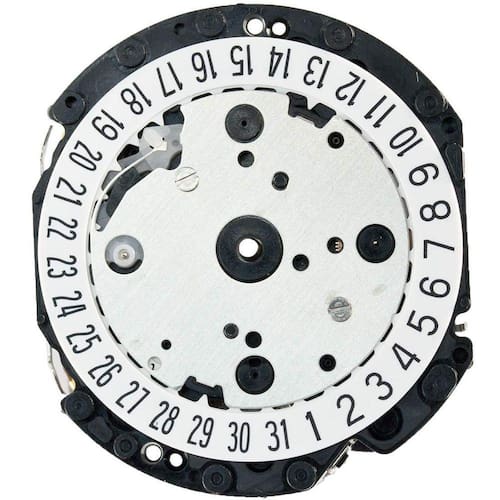 Mecanismo para Relógio de Pulso VD31 Calendário Posição 6Diâmetro externo: 12 3/4 linha ou 29,5 mmMovimento 4,57 mm de espessuraRequer célula de observação 371Requer ponteiros de relógio: hora 1,10, minuto 0,65 e varredura de segundo 0,20 mmData às 6:00Tempo duploPonteiro de 24 horas às 3:00, furo 0,14 mmPonteiro de 24 horas às 9:00, furo 0,14 mmNÃO tem joiasFornecido com haste: 351177, torneira 10Inclui haste de relógioMovimento de quartzo Marca: Hattori