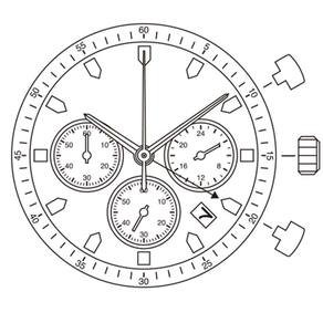 Mecanismo para Relógio Miyota FS26 Miyota FS26, 10 1/2 linha, 3 ponteiros, Data 4:30, 3 olhos 6,9,12 , Hora dupla, cronógrafo, Movimento de quartzo japonês