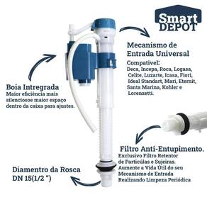 A maioria dos mecanismos de entrada começam a encher a caixa acoplada imediatamente após o acionamento da descarga. Portanto, nesse momento, a água que entra na caixa acoplada acaba se misturando e sendo eliminada junto com a que já estava na caixa, ocasionando o desperdício. Desta maneira, visando conter esse desperdício, a Smart Depot implementou essa melhoria: o mecanismo começa a encher a caixa acoplada alguns segundos depois do acionamento. Foi projetado para servir na maioria das caixas acopladas, salvo raras exceções, pois sua altura pode ser ajustada através de um sistema Telescópico.